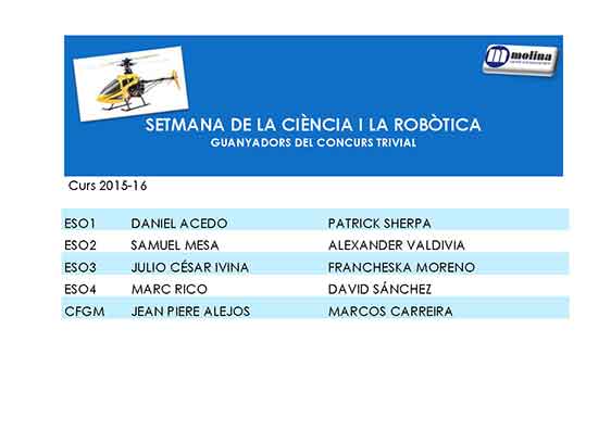 Divendres dia 4 de març es va fer el lliurament de premis del Concurs del Trivial sobre la Ciència i la Robòtica, en el marc de la setmana cultural de la Ciència i la Tecnologia celebrada a la nostra escola.