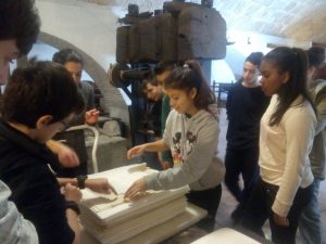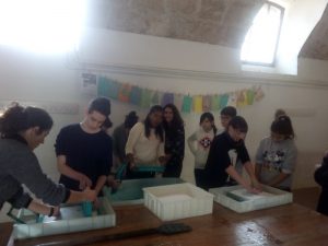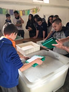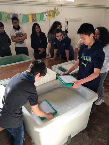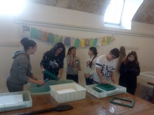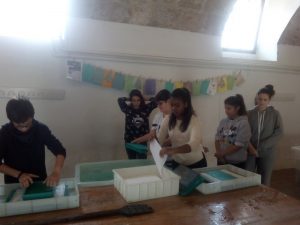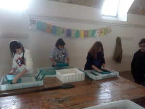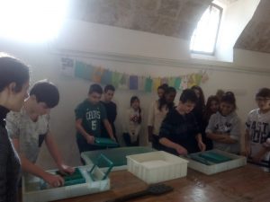 La segona part de la visita ha consistit en fer el nostre propi paper: amb la pasta de paper ja preparada i recordant totes les indicacions que ens havien explicat els guies, hem fet els nostres fulls de paper. Els hem premsat per treure gran part de l’aigua i a l’escola els hem deixat perquè s’assequin del tot.