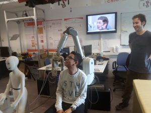 La investigació del grup PERCEPCIÓ I MANIPULACIÓ se centra a millorar la percepció, l’aprenentatge i la capacitat de planificació dels robots per aconseguir majors graus d’autonomia i facilitat d’ús durant les tasques de manipulació quotidiana. Aquí, els alumnes més valents han pogut interactuar amb un robot de braç llarg.