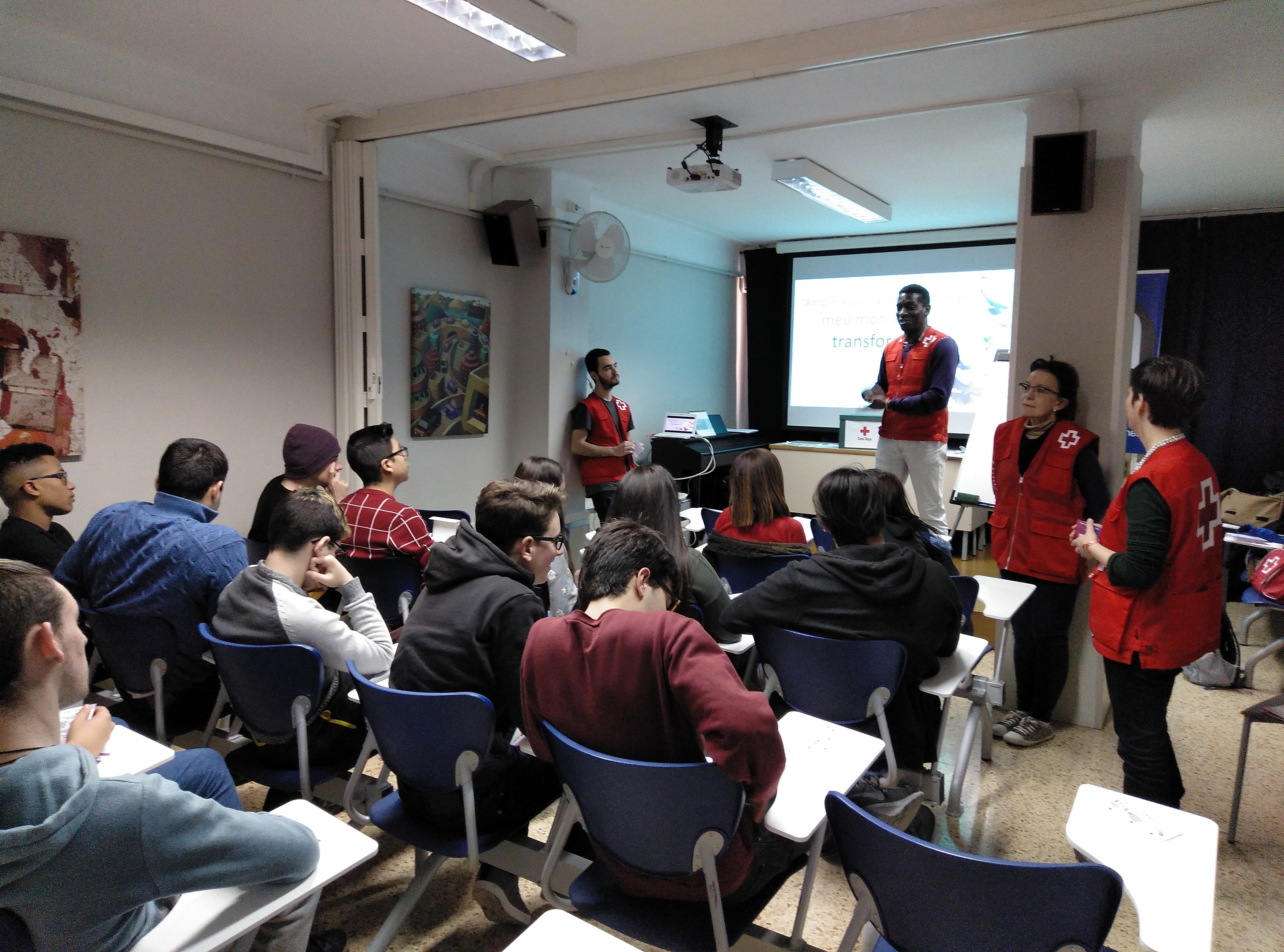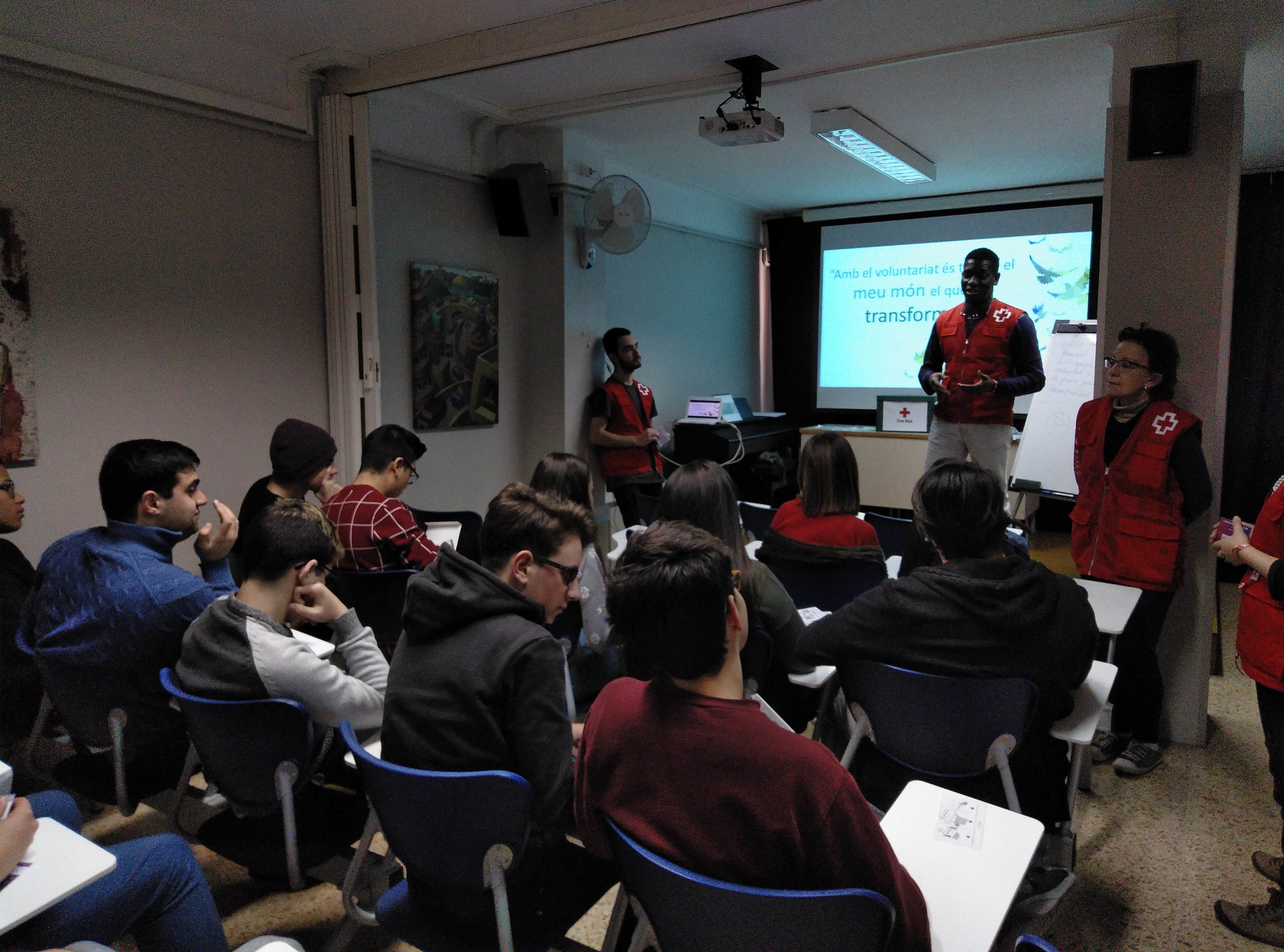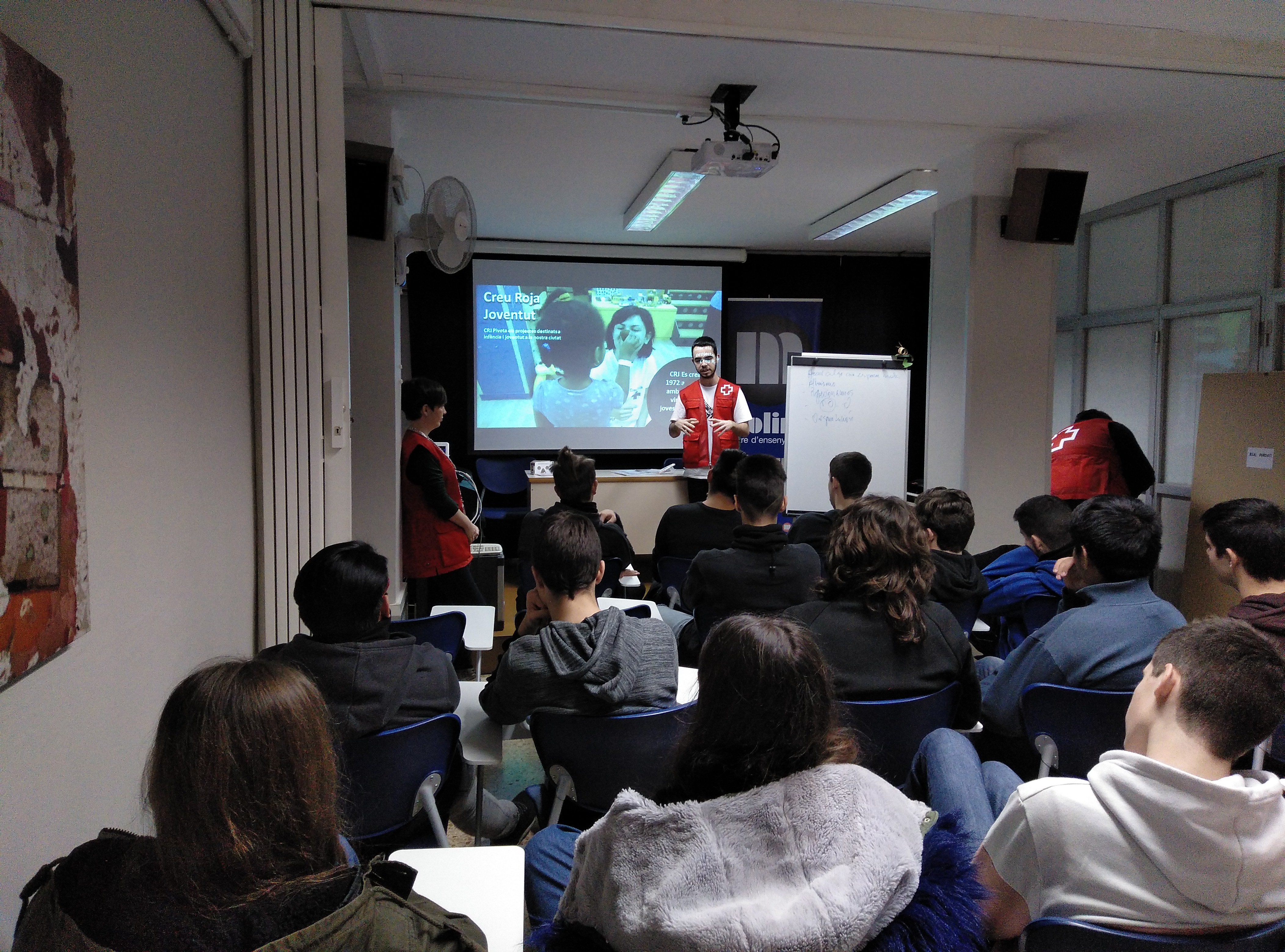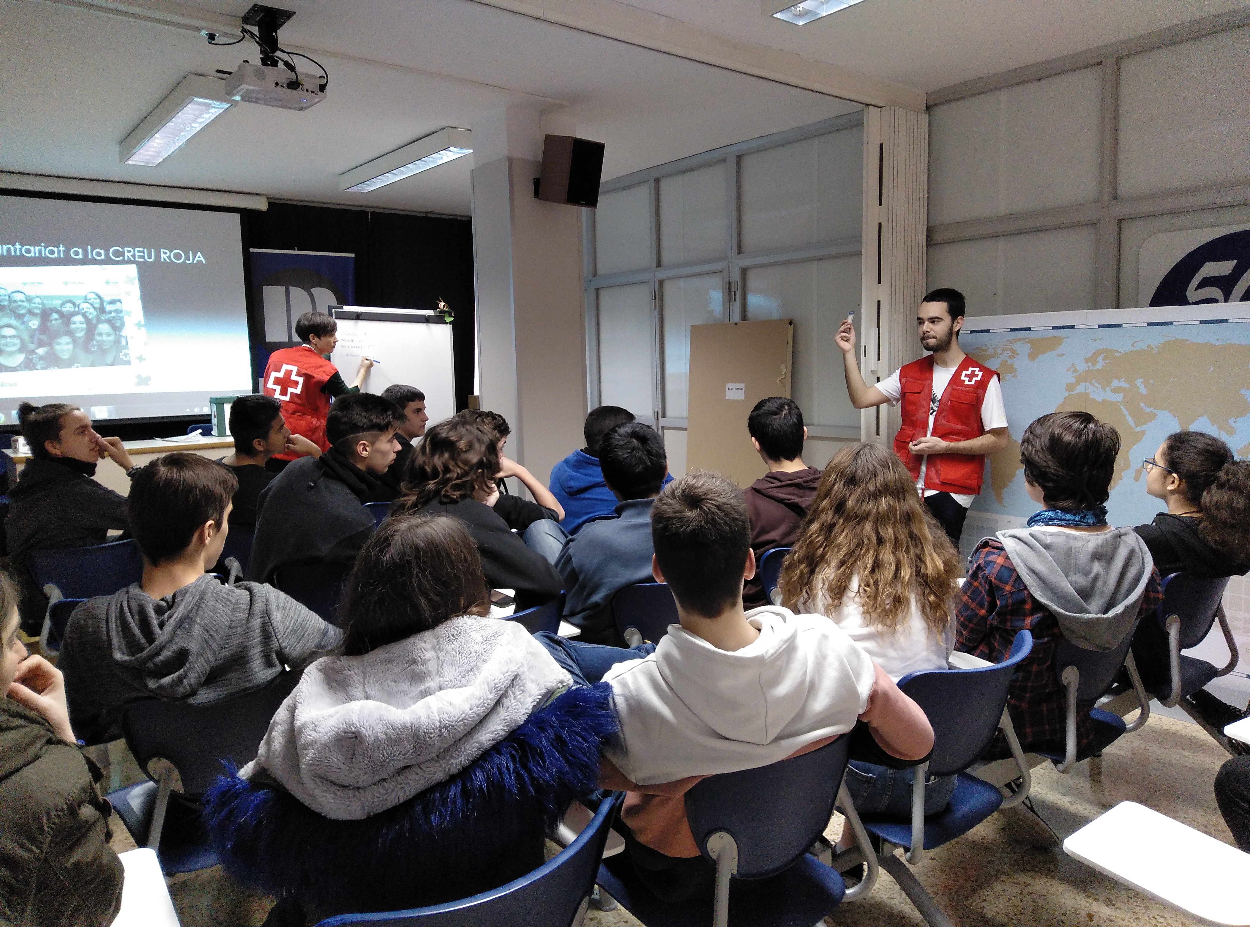 Aquesta setmana els alumnes d’ESO4 i els de CFGM han asssistit a una xerrada que la Creu Roja ha realitzat a la nostra escola. Ha vingut la Laura, responsable d’un projecte per a joves i tres voluntaris, per explicar-nos les seves experiències en aquesta institució.