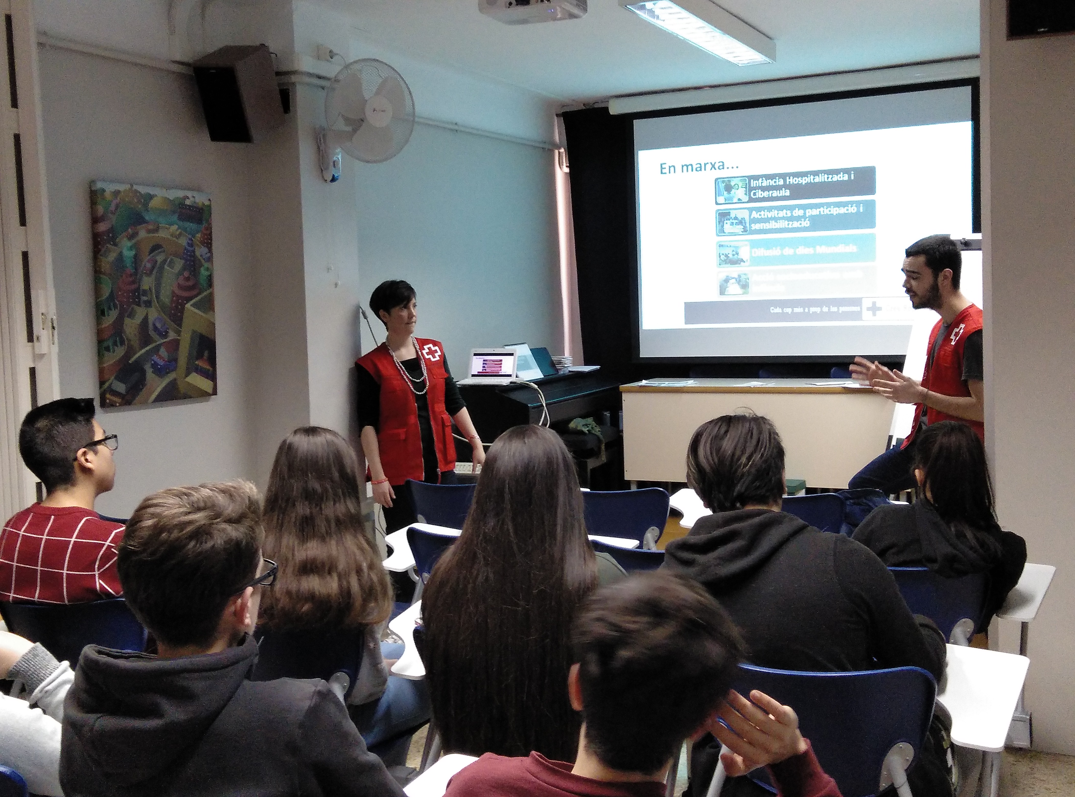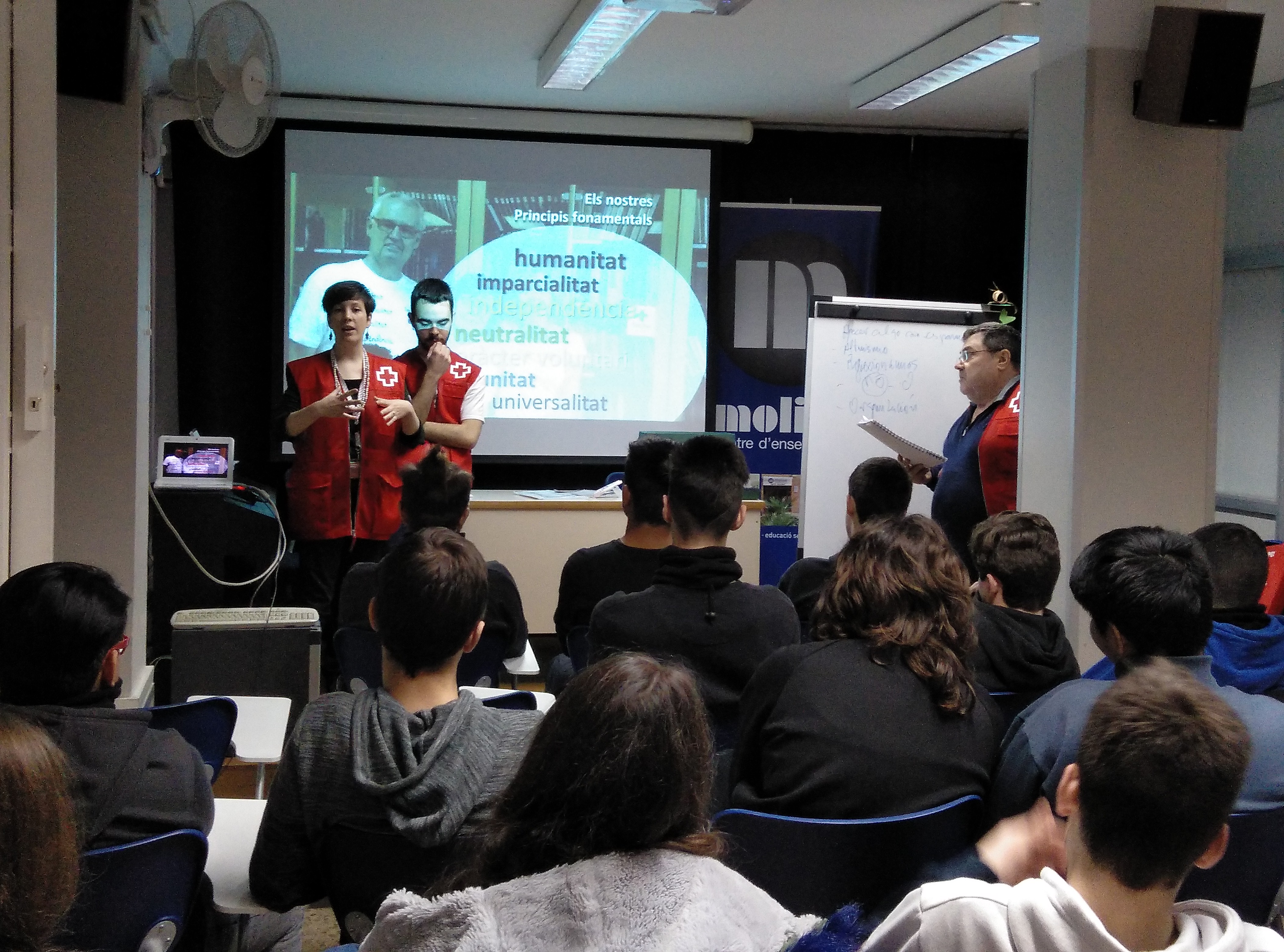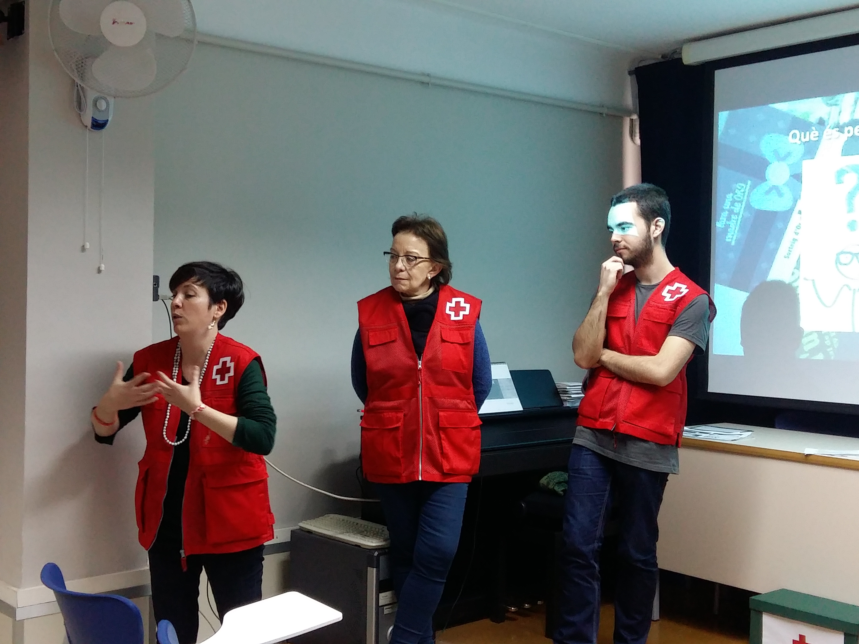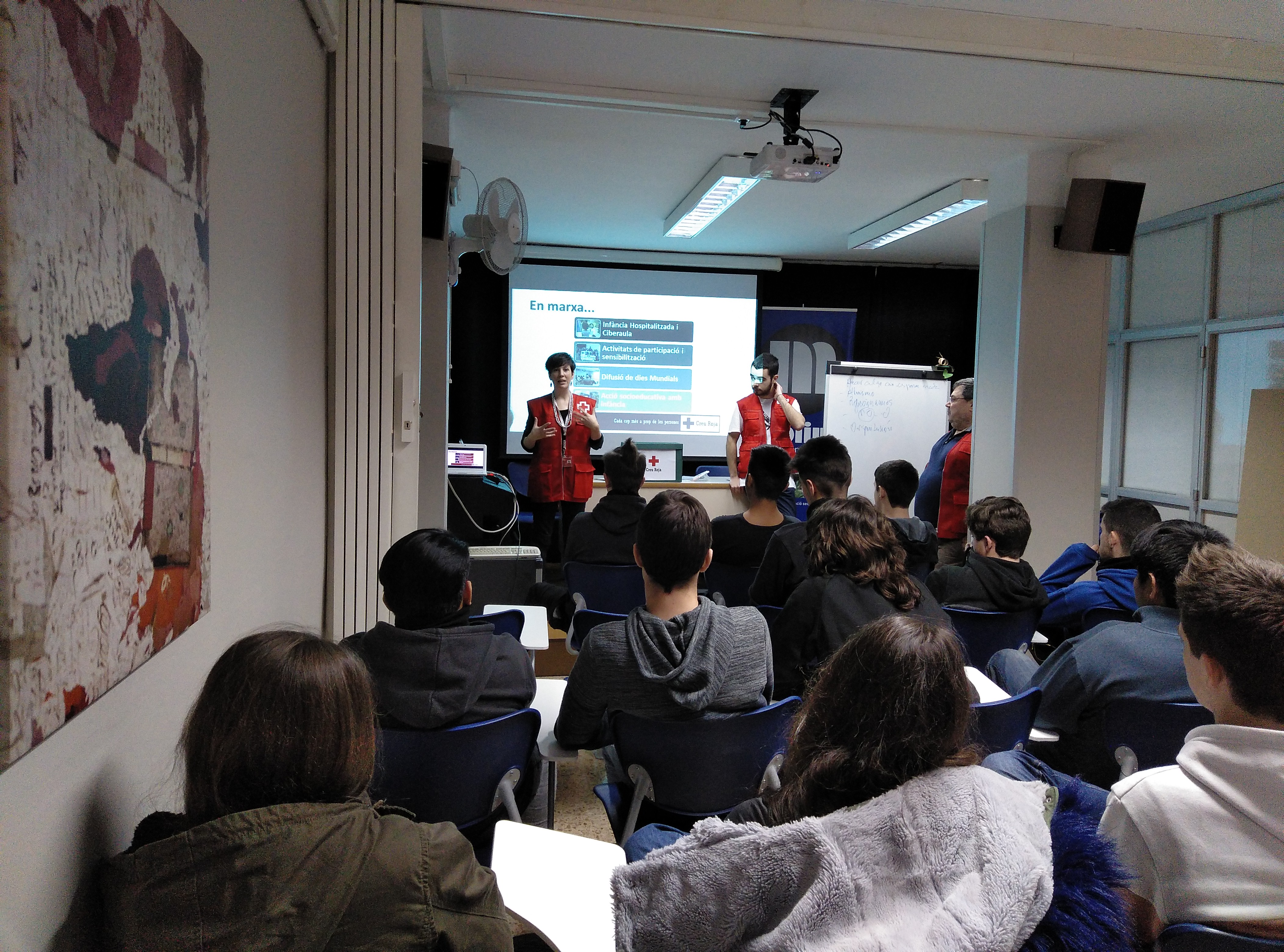 Aquesta setmana els alumnes d’ESO4 i els de CFGM han asssistit a una xerrada que la Creu Roja ha realitzat a la nostra escola. Ha vingut la Laura, responsable d’un projecte per a joves i tres voluntaris, per explicar-nos les seves experiències en aquesta institució.
