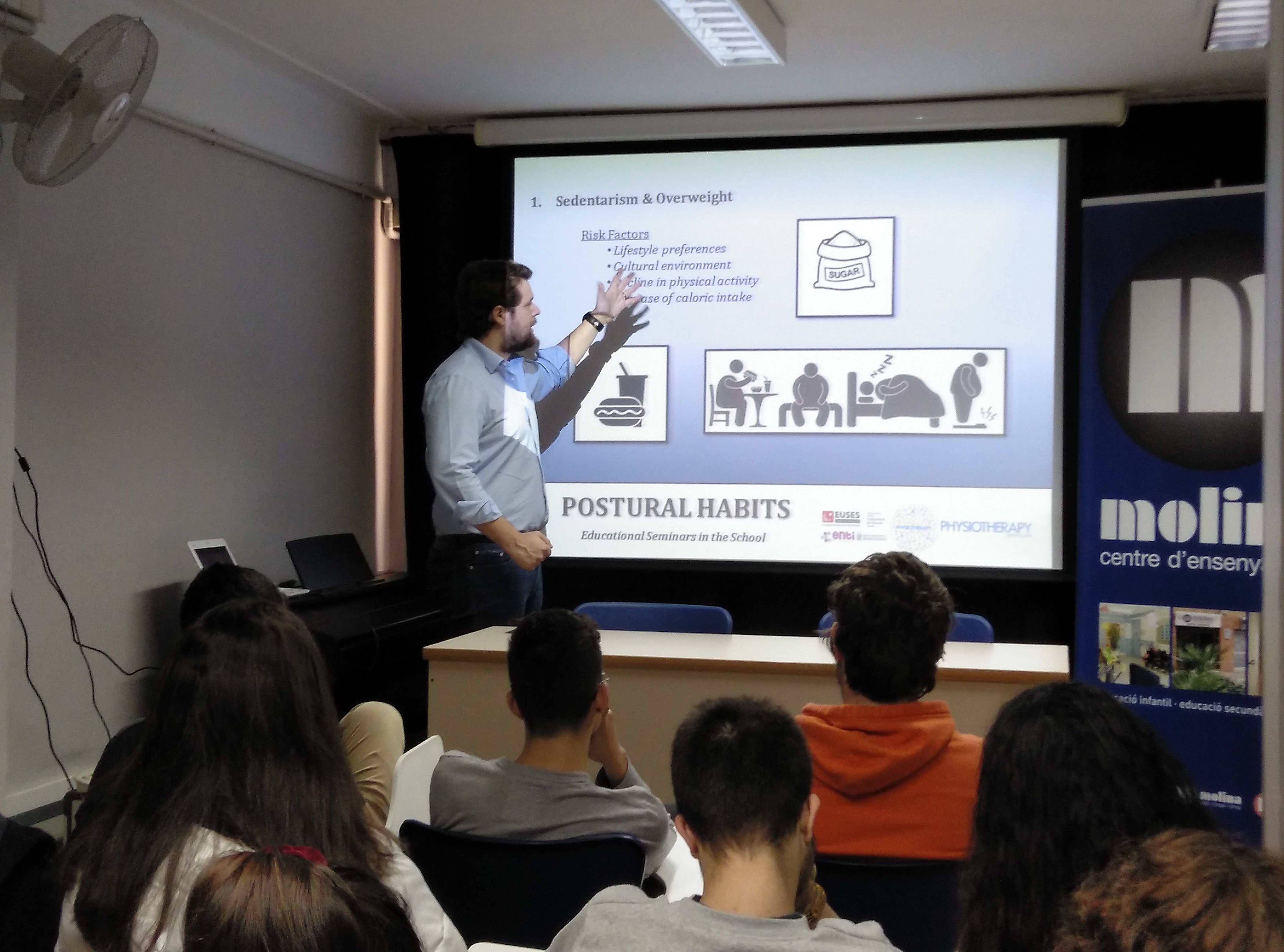 Els alumnes d’ESO3 i ESO4 han realitzat el taller ” Els hàbits posturals per a la millora de la Salut ” en anglès. Han treballat el sedentarisme i l’obesitat actual al món, sobretot al països del primer món i els factors de risc. S’ha fet un anàlisi de la importància del moviment i de l’esport no intens, així com també de la higienepostural en les activitats quotidianes, sobretot en l’àmbit escolar. Per acabar tant la Nuria Broo, graduada en Fisioteràpia com en Mariano Gacto-Sánchez, Director del Grau de Fisioteràpia, ens han fet recomanacions per adquirir uns bons hàbits posturals.