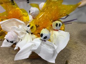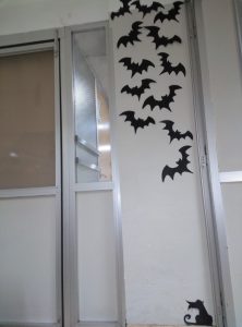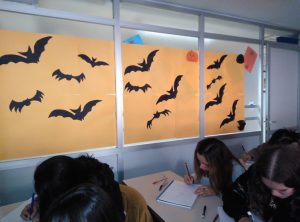 Primer vam fer les decoracions, tan les que feien referència a la Castanyada com a Halloween, per les aules, pels passadissos i per l’entrada de l’escola. Vam gaudir del treball en equip: uns realitzaven els guarniments, els altres els preparaven per penjar i un altre grup es va encarregar de penjar-los. Cadascú va poder triar en quin “departament” estava més a gust i volia treballar, i quan les coses es fan col.laborativament tot surt millor.