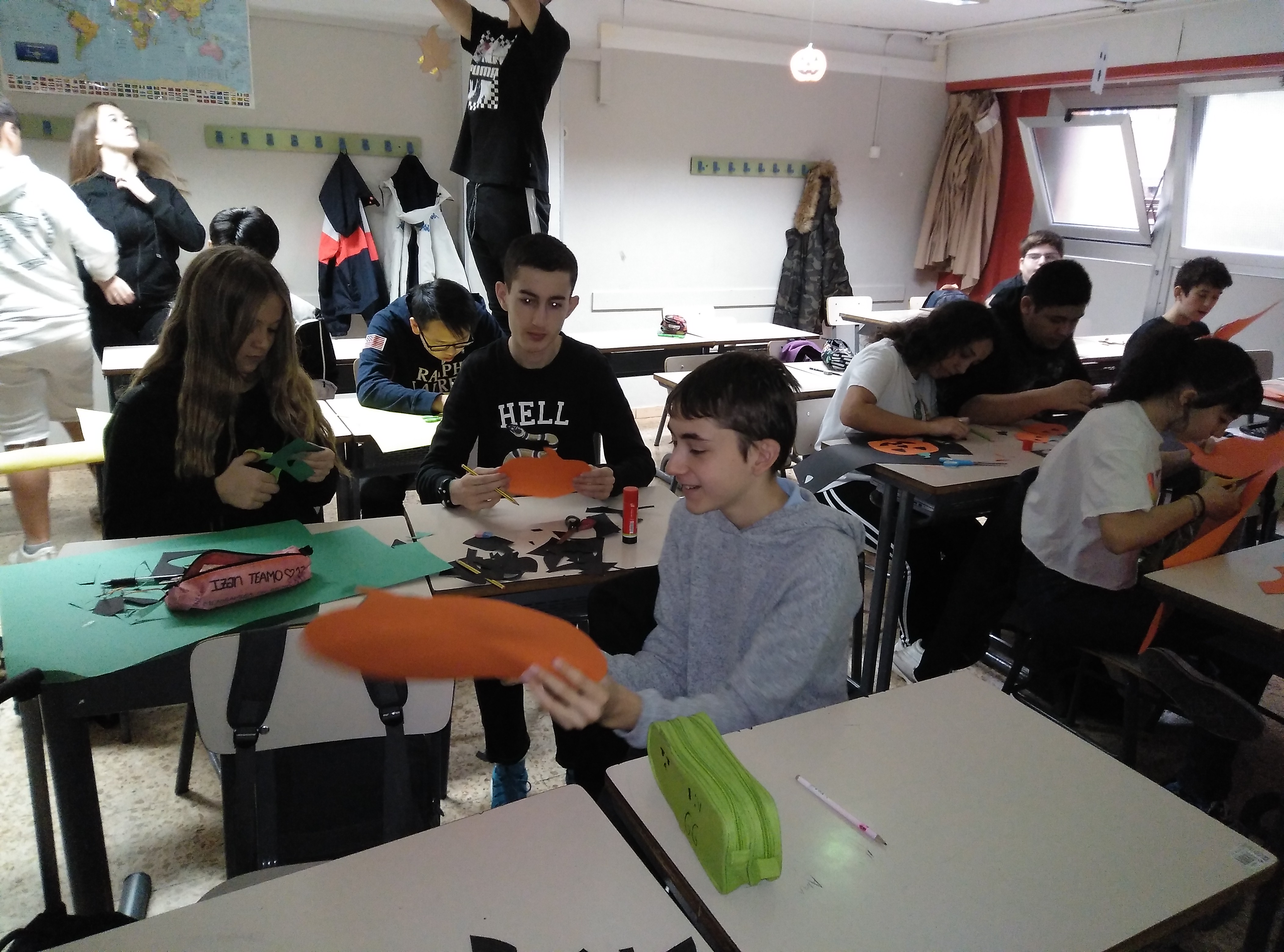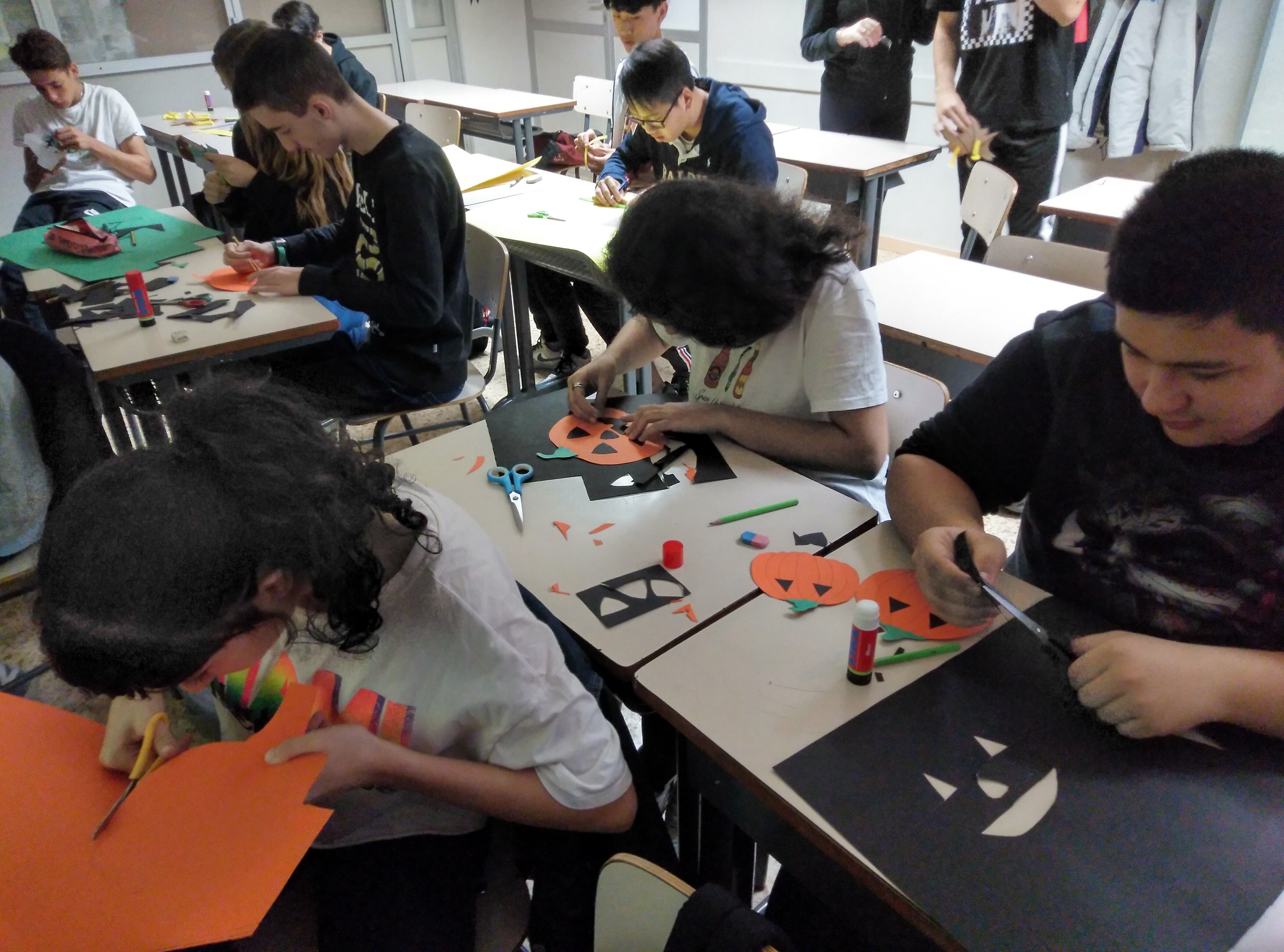 Primero hicimos las decoraciones, tanto las que hacían referencia a la Castañada como Halloween, por las aulas, los pasillos y por la entrada de la escuela. Disfrutamos del trabajo en equipo: unos realizaban los adornos, los otros los preparaban para colgar y otro grupo se encargó de colgarlos. Cada uno pudo elegir en qué «departamento» estaba más a gusto y quería trabajar, y cuando las cosas se hacen colaborativamente todo sale mejor.