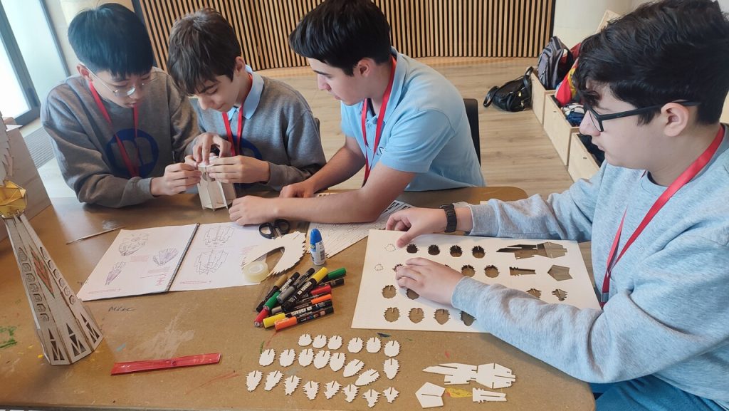 Una vez terminamos la visita, empezamos el taller. Los alumnos se dividieron en 5 grupos con el objetivo de construir, con cartón, cada una de las torres de los cuatro evangelistas y la torre de María. Estas torres son las torres que se han construido y coronado en los últimos años.