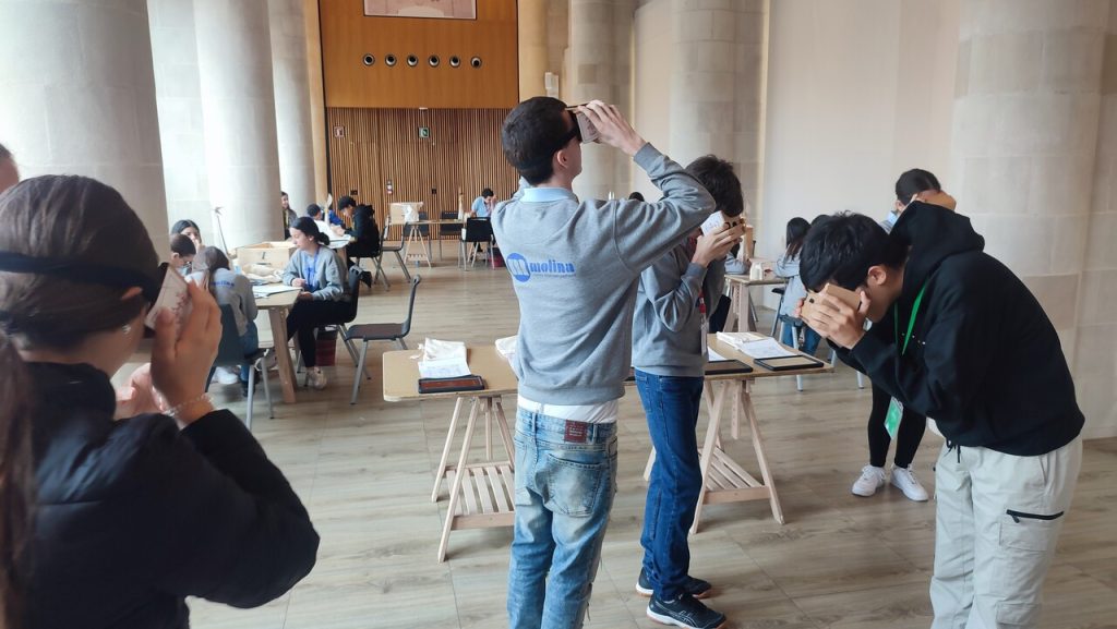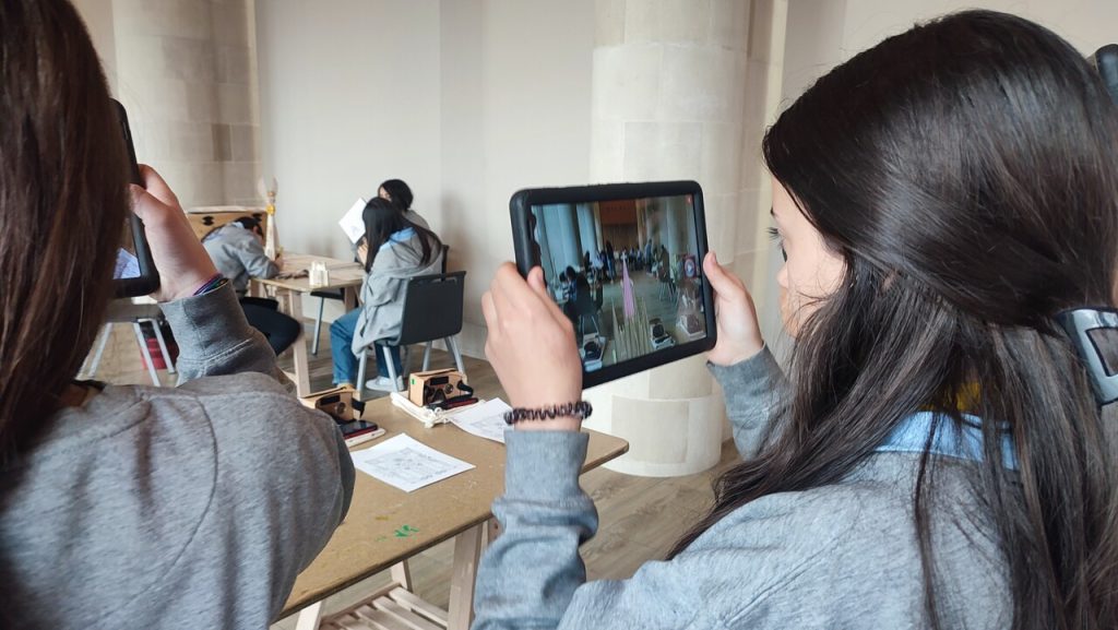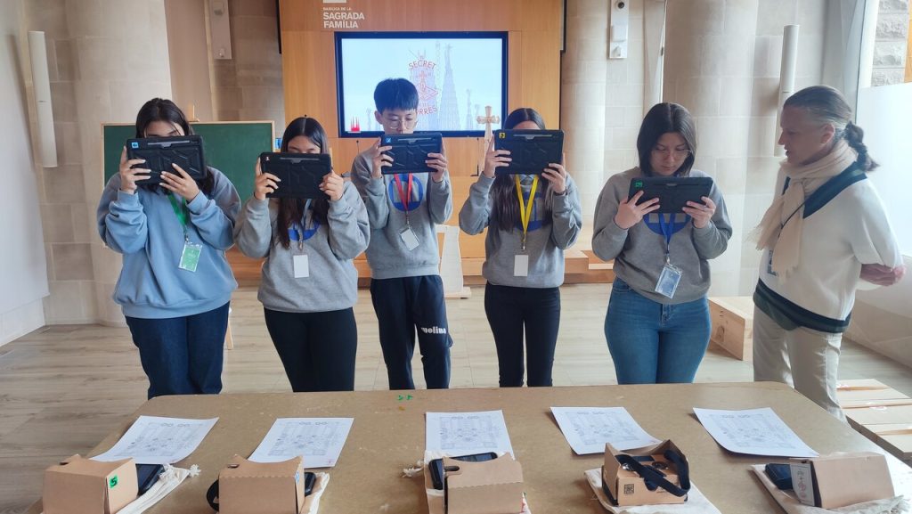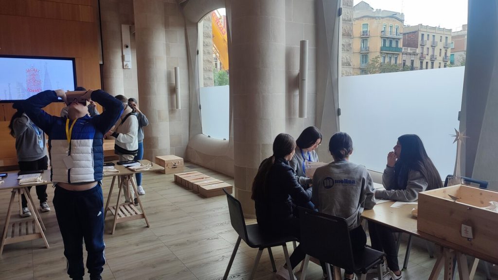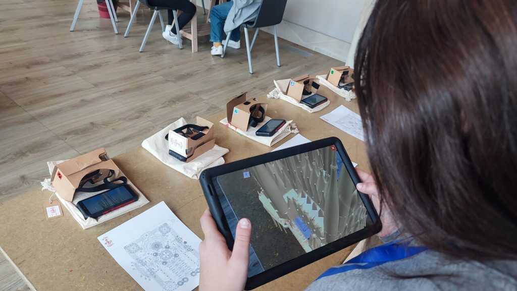 Mientras los chicos y chicas iban siguiendo las instrucciones para la construcción de las torres, pudieron utilizar las nuevas tecnologías para visitar virtualmente la Sagrada Familia completa. Por un lado, con una tablet recrearon una representación en RA (realidad aumentada) con puntos de interés interactivos. Por otra parte, con unas gafas de realidad virtual entraron en una simulación del templo y pudieron visitarla a vista de pájaro. ¡La verdad es que fue muy divertido!
