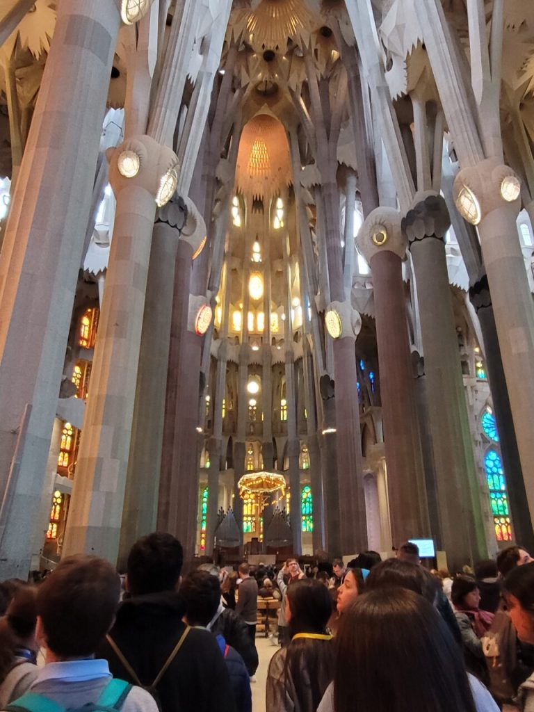 Después de realizar la visita exterior y en las maquetas, pudimos entrar dentro del templo. Había bastante gente, pero pudimos disfrutar de cómo entraba la luz por las vidrieras, cuyos colores y disposiciones no son aleatorias. La guía nos explicó que había una zona en la que cada vidriera representaba, con colores, cada continente.